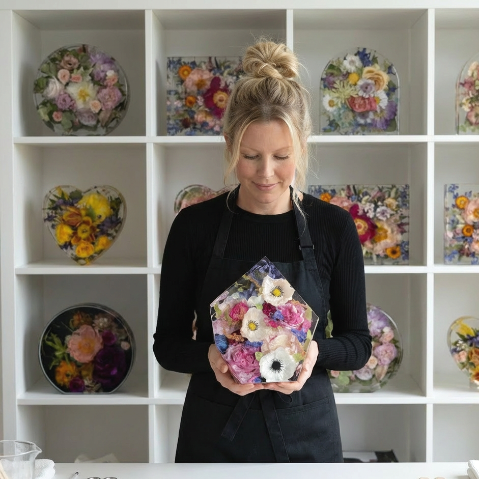 Today, I specialise in preserving wedding, memorial, and sentimental flowers, transforming them into bespoke resin keepsakes. Every piece is created by hand, with patience, precision, and respect for the emotional significance behind each set of flowers. My background as a PA means I approach every order with professionalism, clear communication, and meticulous attention to detail — while my creative journey allows me to bring warmth, empathy, and artistry into each piece I create.